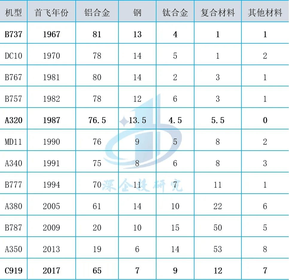 C919钛合金用量显著领先,彰显材料手艺冲破。钛合金的高比强度(强度取钢相当,密度低40%)使其成为减沉环节材料,同时其耐侵蚀、耐高温、抗委靡等特征显著提拔了飞机的布局效率取经济性。C919大型客机正在布局材料选择上实现了严沉冲破,钛合金用量达到机身布局分量的9。3%,远超同级别机型波音737(4%)和空客A320(4。5%),表现了国产大飞机对轻量化取机能优化的逃求,也标记着我国正在航空材料范畴的手艺前进。此外,C919初次使用钛合金3D打印手艺,进一步提拔了制制效率。
