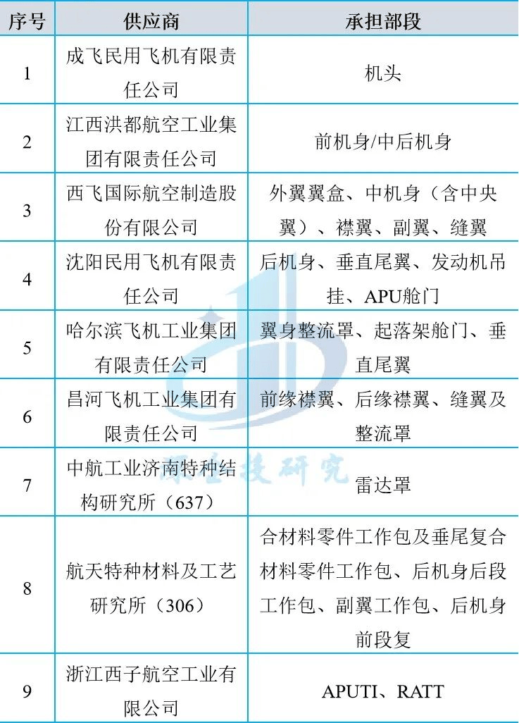 C919机体九大部件接近100%国产化,航空工业系企业从导分工。C919由9家国内企业完成全机大部段拆卸,次要为航空工业部属企业。2009年5月26日,正在上海举行的C919大型客机机体供应商理解备忘录签订典礼上,中航工业部属的济南特种工艺研究所(637所)、成飞平易近机、江西洪都、西飞国际、沈飞平易近机、哈飞、昌飞,以及西子航空、航天海鹰这9家国内企业取中国商飞公司签订了供应商理解备忘录。具体分工为:637所担任雷达罩;成飞平易近机担任机头;航空工业洪都担任前机身取中后机身;西飞国际担任拆卸外翼翼盒、中机身(含地方翼)、襟翼、副翼、缝翼;沈飞平易近机担任拆卸后压力框部段、后机身前段、策动机吊挂、垂曲尾翼;哈飞担任翼身整流罩、升降架舱门、垂曲尾翼;昌飞担任前缘襟翼、后缘襟翼、缝翼及整流罩;航天海鹰担任后机死后段、副翼;西子航空衔接C919大飞机APU舱门和RAT舱门的研制制制使命。