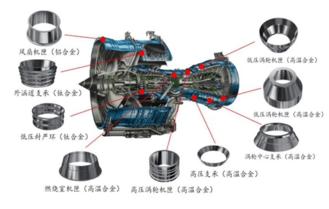锻铸件是航空制制范畴的核构件,正在飞机及策动机制制中占领主要地位。正在飞机制制方面,锻件次要用于制制承受交变载荷和集中载荷的环节主要零件。其制成的零件分量正在飞机机体布局分量中占比约20%-35%,正在策动机布局分量中占比约30%-45%。机身布局件多为模锻件,涵盖舱门门框、机头风挡边框、机翼取机身毗连件、机翼边条、承力梁、框锻件、策动机吊挂系统锻件、机身承力框锻件以及转向舵转轴梁锻件等。正在航空策动机制制中,锻件以盘环件为从,包罗封严环、支承环、电扇法兰环、固定环、压缩机级间挡圈、燃烧室喷管外壁环件、涡轮导向环、整流环等。从价值量来看,根据证券导据,锻件正在飞机构件中的价值占比约6%-9%,正在飞机策动机中的价值占比约15%-20%。