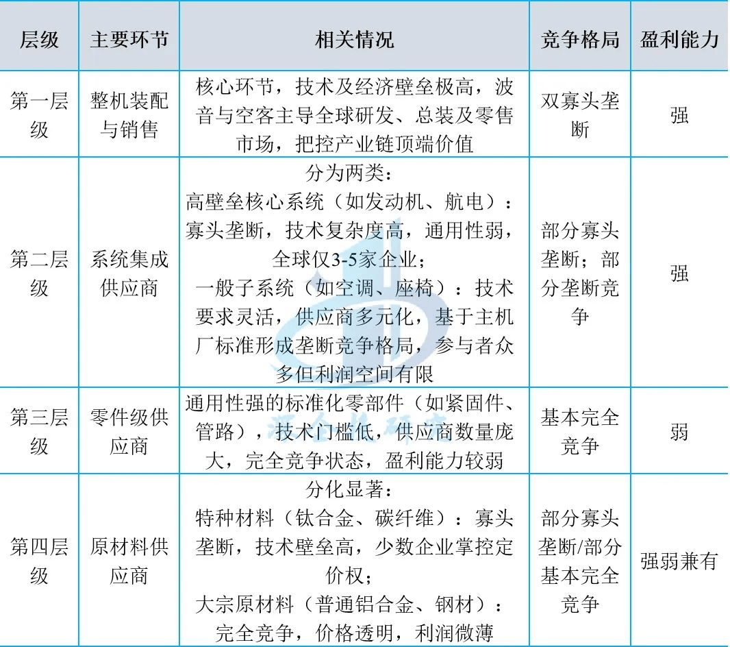 平易近用航空制制供应链具有链条长、复杂度高、附加值分层显著的特征。其财产环节可划分为中上逛制制取下逛办事两大部门,此中中上逛以飞机零件及环节零部件研发制制为焦点,下逛涵盖维修、征询及金融办事等。供应链层级分化较着,分歧环节的合作款式取盈利能力差别显著,具有以下特征:1)手艺壁垒取垄断性凸起:焦点环节(如零件拆卸、策动机)呈现高度集中化,头部企业凭仗手艺堆集和规模效应构成护城河;2)附加值逐级递减:越接近终端产物的环节附加值越高,原材料及通用零件环节利润空间较小;3)全球化分工深化:高附加值环节由欧美巨头从导,中低端制制向新兴市场转移,中国正在机体布局、复材等细分范畴加快冲破。