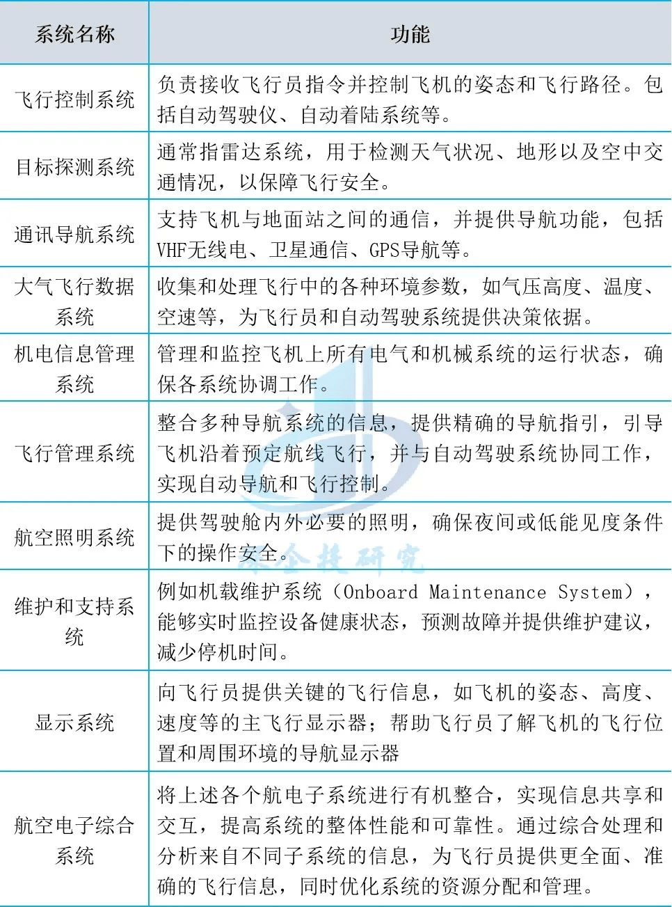航电系统即航空电子系统,是飞机上所有电子系统的总称,它对于飞机的飞翔平安、效率以及使命施行能力起着环节感化,各子系统协同工做以保障飞机的各项功能实现。大飞机的航电系统次要包罗飞翔节制系统、方针探测系统、通信系统、大气飞翔数据系统、机电消息办理系统和航空照明系统等。通过上述各子系统的协同工做,航电系统为飞翔员供给了全面的飞翔消息支撑,加强了飞翔的平安性和效率。同时,跟着手艺的前进,航电系统也正在不竭向更高集成度、智能化标的目的成长。